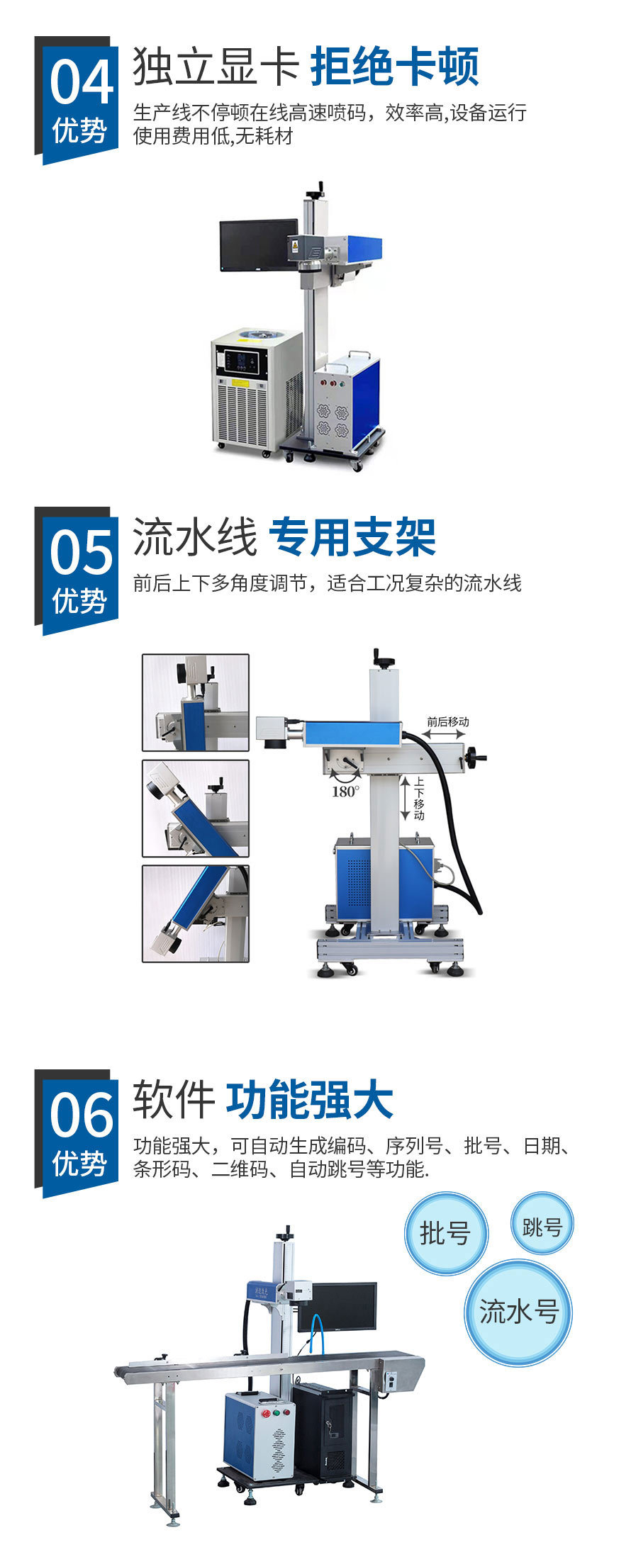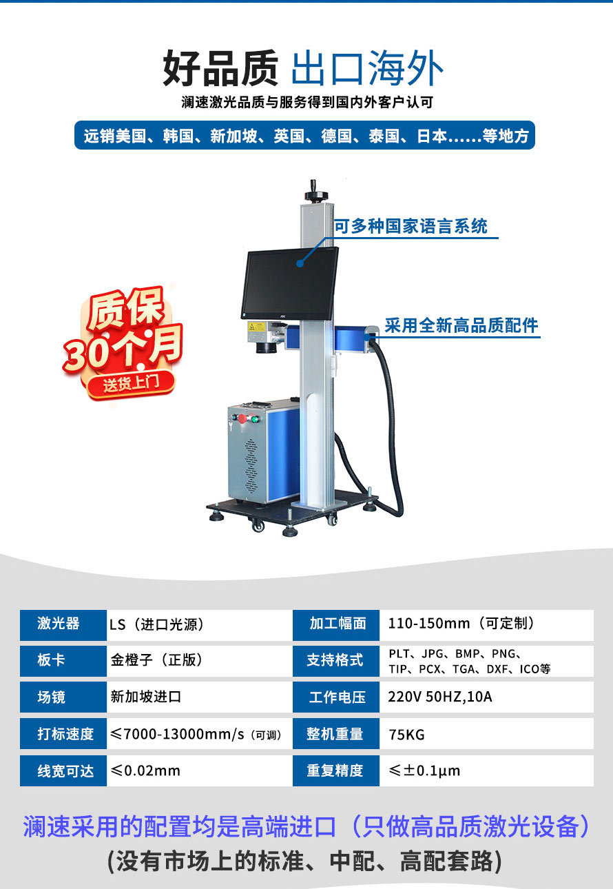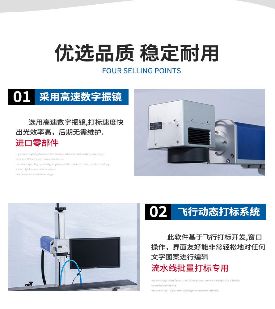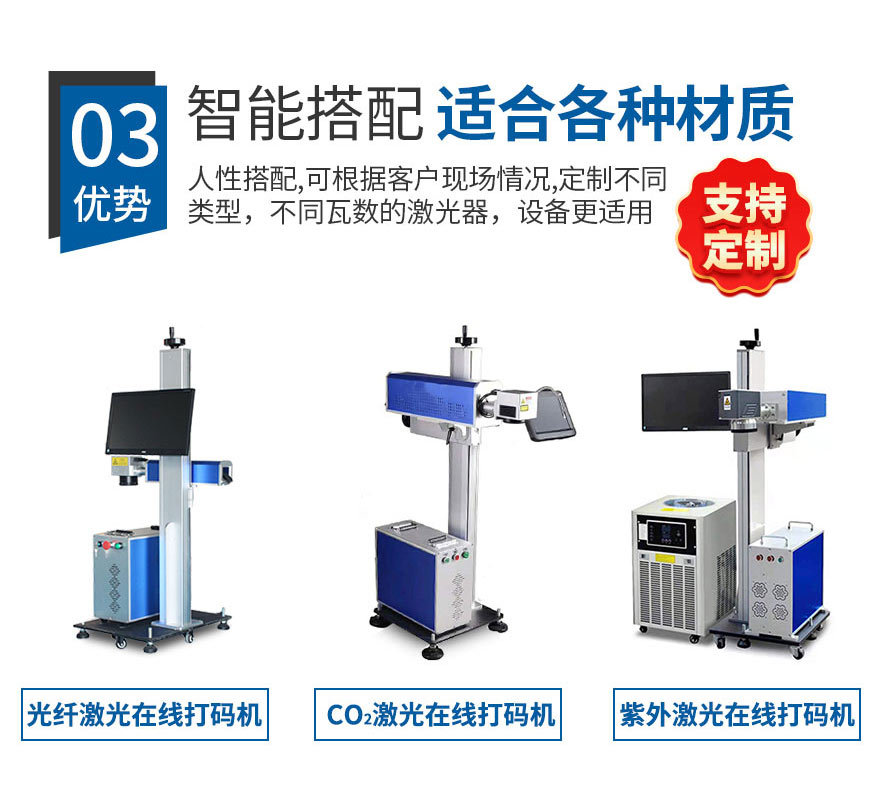 2、在線式飛行激光打標(biāo)機(jī)直接與流水線配合,減少人工成本,操作人員可以避開惡劣生產(chǎn)環(huán)境。 3、滿足標(biāo)記打標(biāo)的多樣化需求,自動(dòng)化生產(chǎn)、流水線生產(chǎn)、以及非常規(guī)界面材質(zhì)的需求。 4、功能強(qiáng)大,具有較強(qiáng)的文字編排和圖形處理功能,可自動(dòng)生成批號(hào)和流水號(hào)、跳號(hào)。 5、省電節(jié)能,整機(jī)功率僅600W,一小時(shí)不到1度電。" />